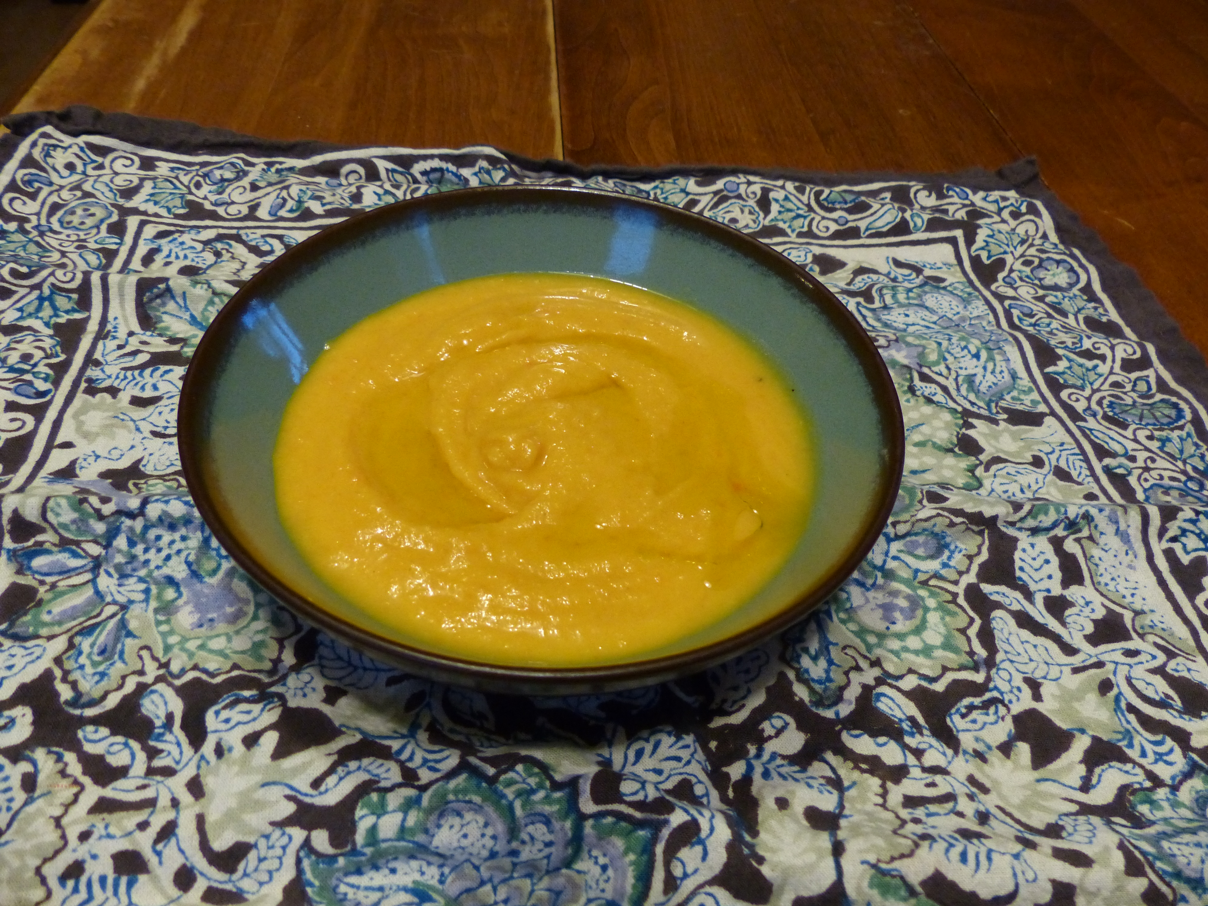 Once the veggies are easily pierced, add them to a blender or food processor with the stock. If your blender will not fit all of the stock and veggies, then blend in two batches by dividing the veggies in half and blending with 3 cups of stock, then repeat. Blend until creamy-smooth. Pour into a large soup pot and gently warm up on the stove.