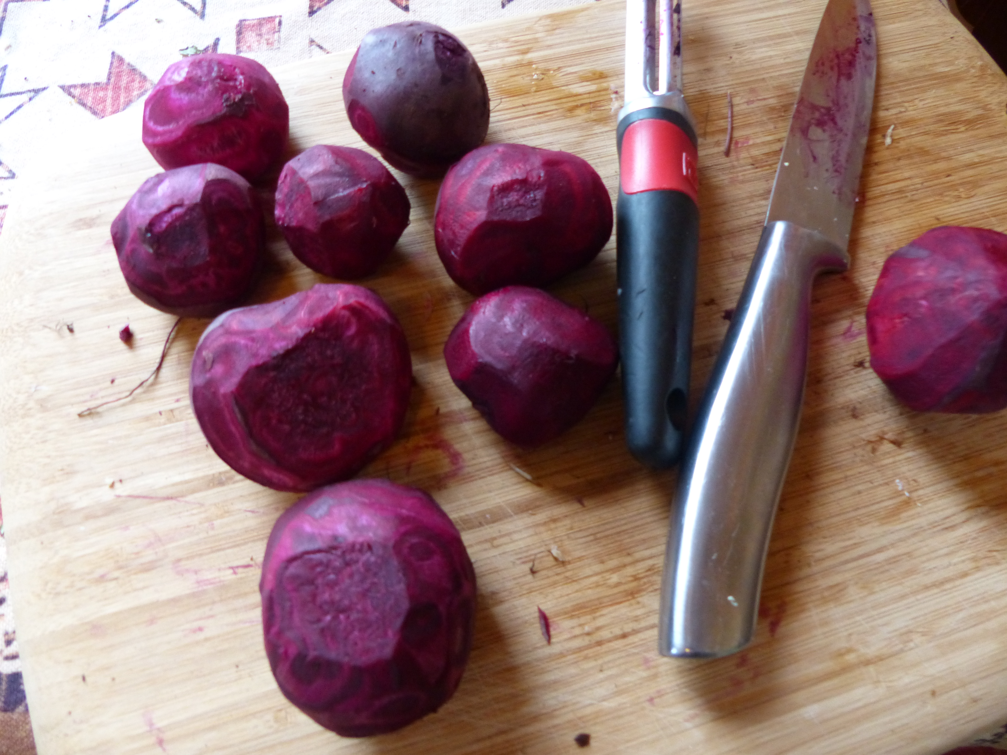 Chop the greens and the root tails off of the beets, and peel them. If you don’t want your hands to take on a lovely pink hue, then grab a pair of gloves before you start working with the beets.
