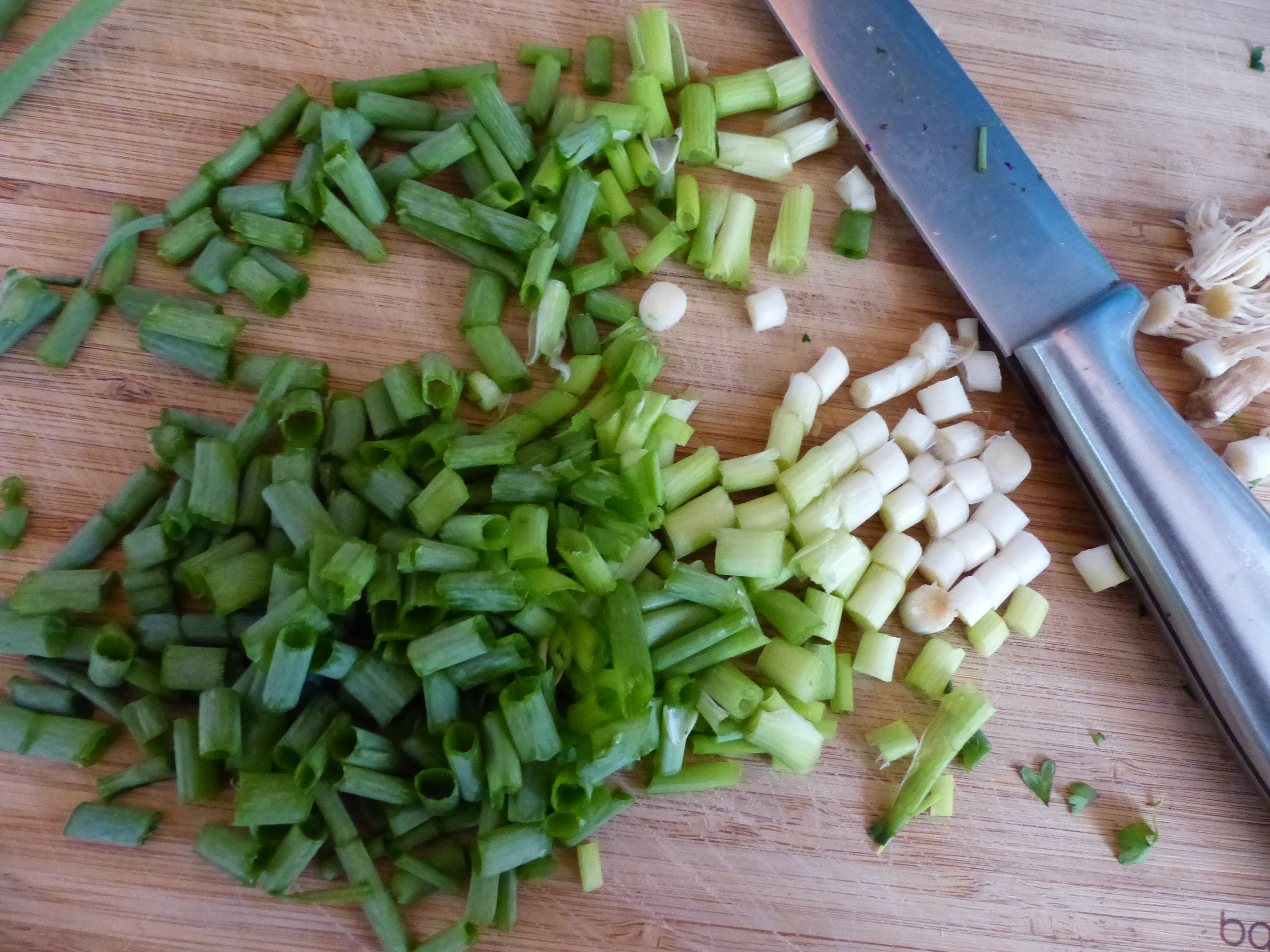 In the meantime, slice the green onions into one cm slices. Roughly chop the cilantro. Place both the green onions and the cilantro into a salad bowl to await the steamed beets.
