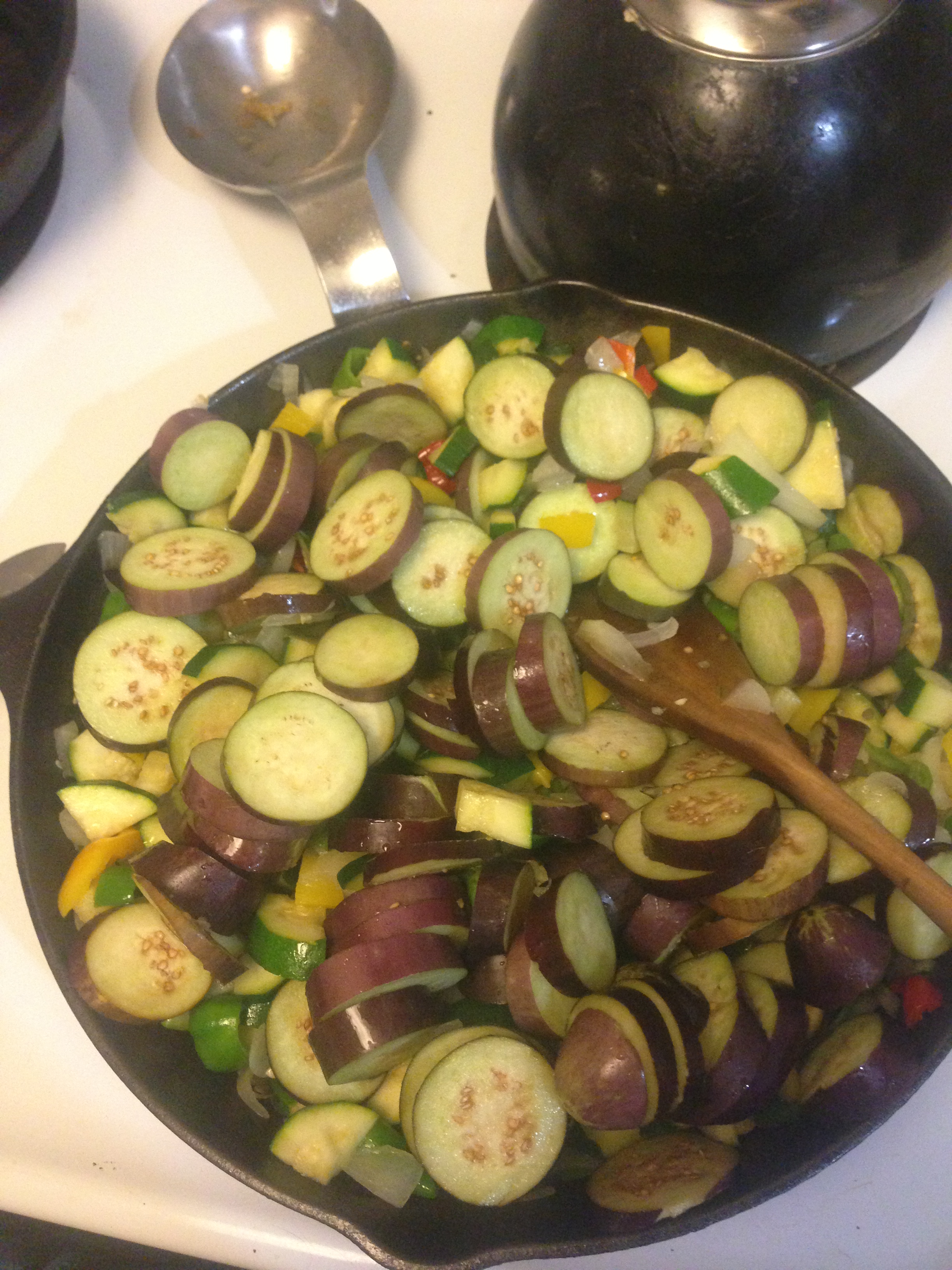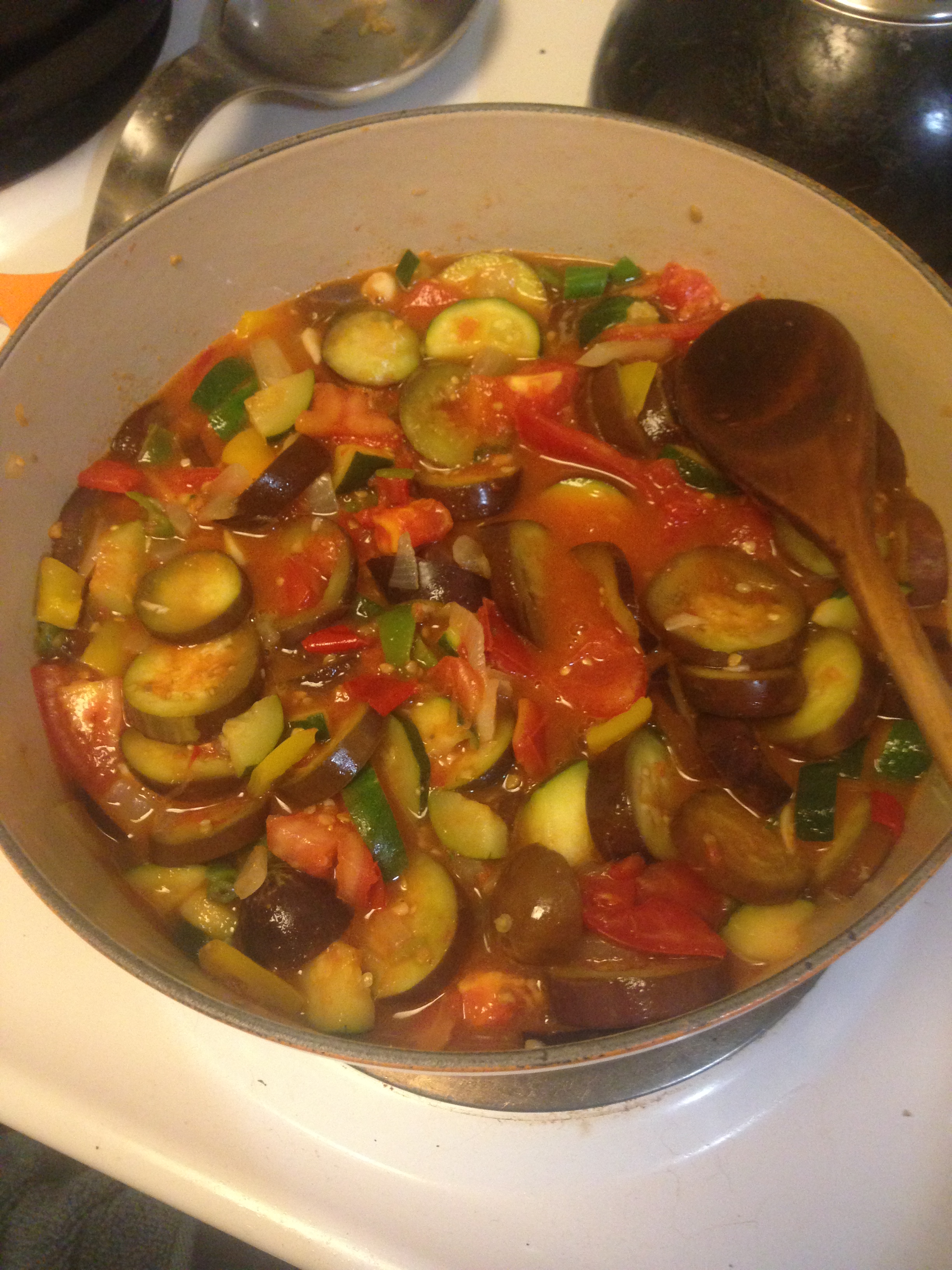 Meanwhile, roughly chop the tomatoes, the fresh thyme, and garlic. Add them to the pot after the eggplant has begun to soften. Stir thouroughly. Reduce heat to low and simmer for another 30-45 minutes. You want the zucchini and the eggplant to be extremely tender at the end of the cooking.