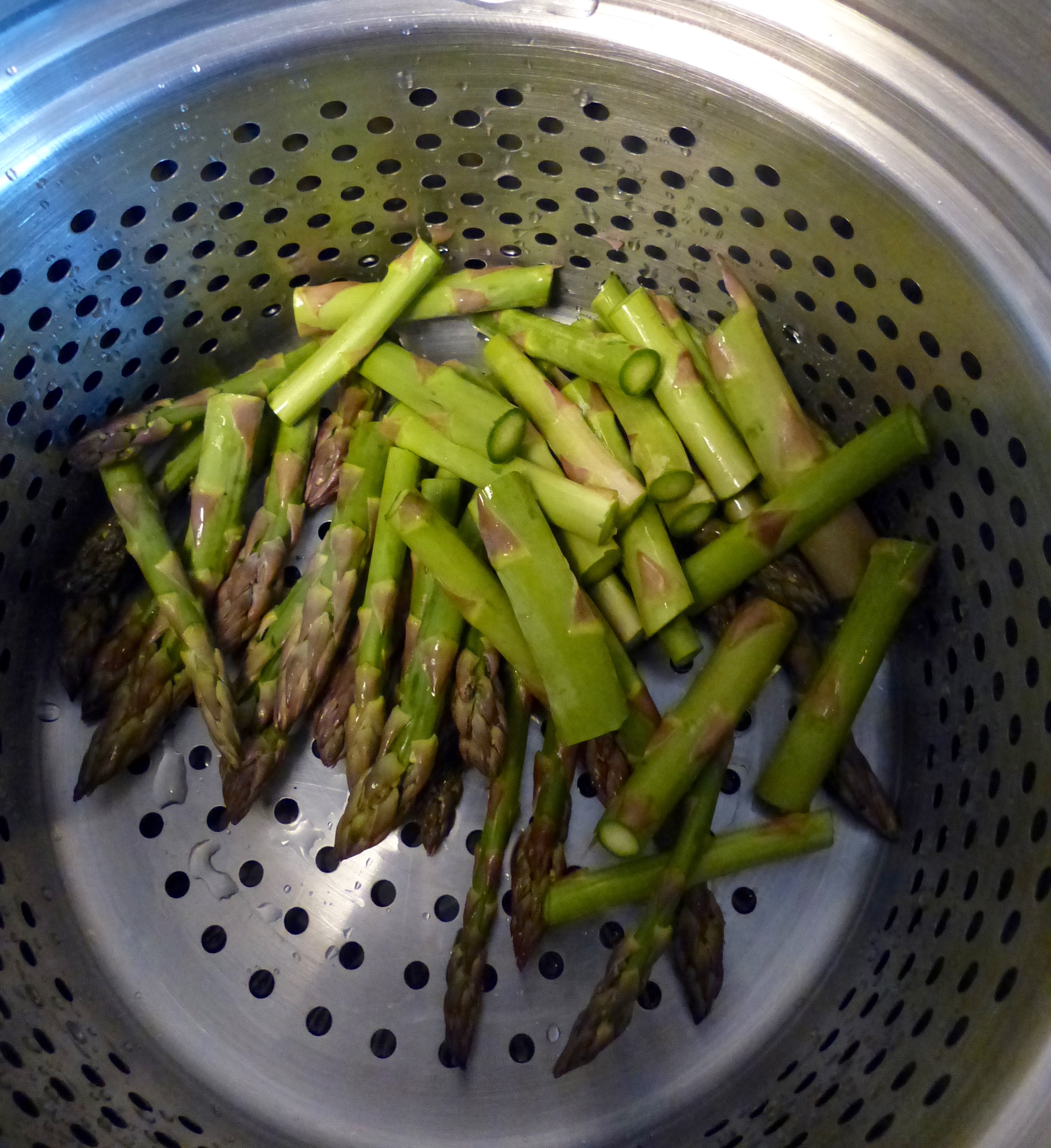 Chop off the rough ends of the asparagus. Cut the asparagus spears in halves or thirds and place in a vegetable steamer. Make to add water in the bottom, I’ll admit I’ve forgotten when in a hurry and had a nasty surprise. Steam the asparagus until tender with a slight crunch. It tends to take me 10 minutes from turning the burner on high to having the spears steamed to the consistency I like.