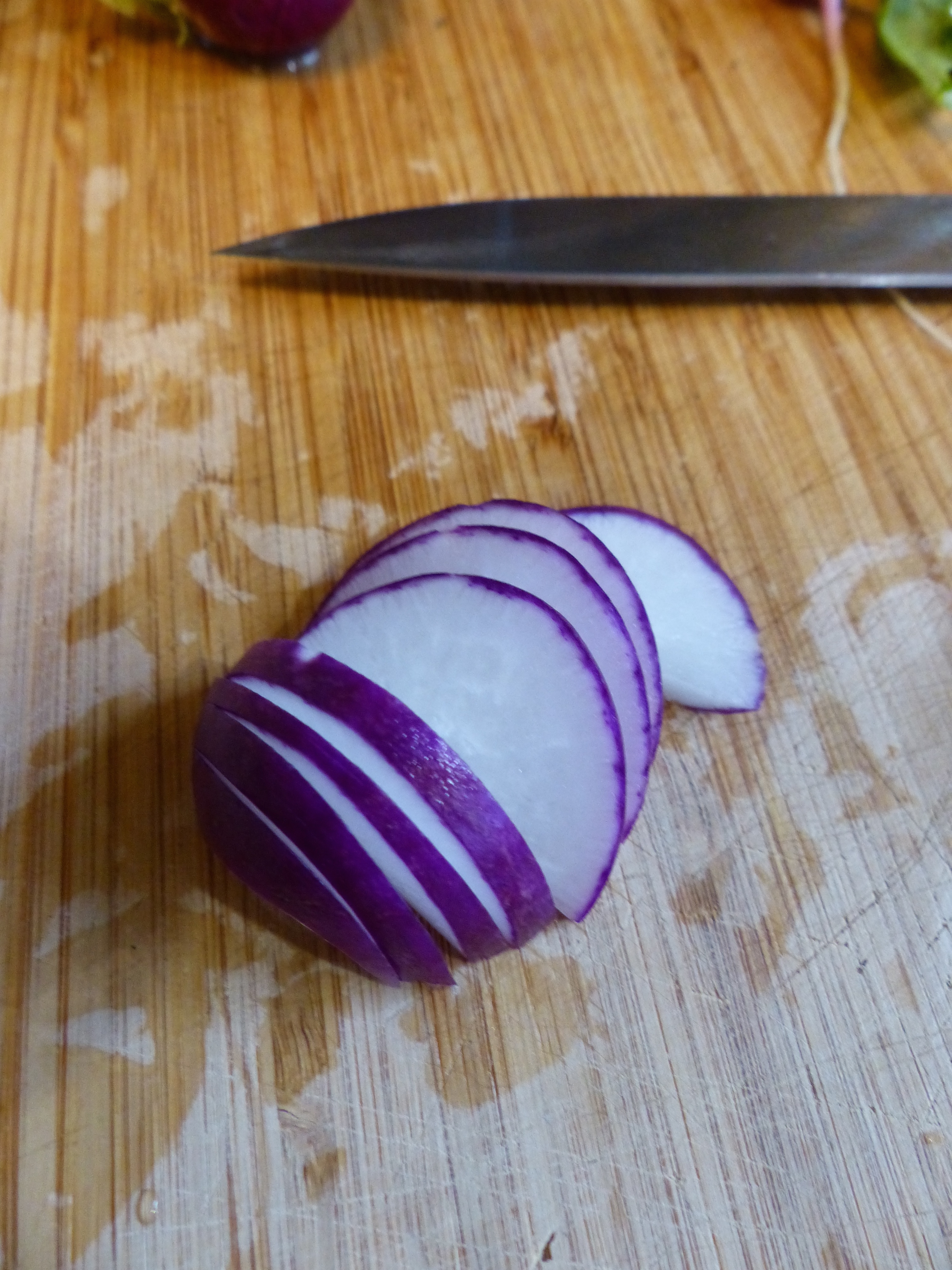 While the asparagus is steaming, thinly slice the radishes.