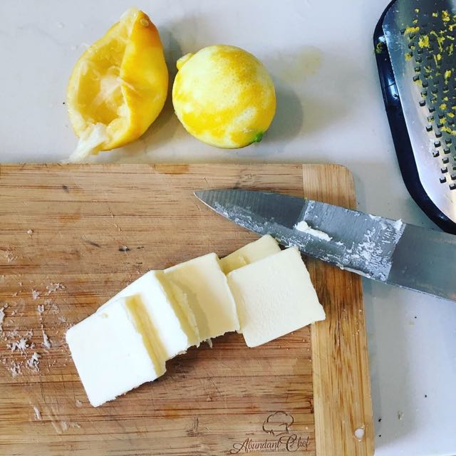 Cut the butter into 1/2 inch wide sections and set aside. You’ll use it at the end. (simply set aside the coconut cream if making vegan curd).