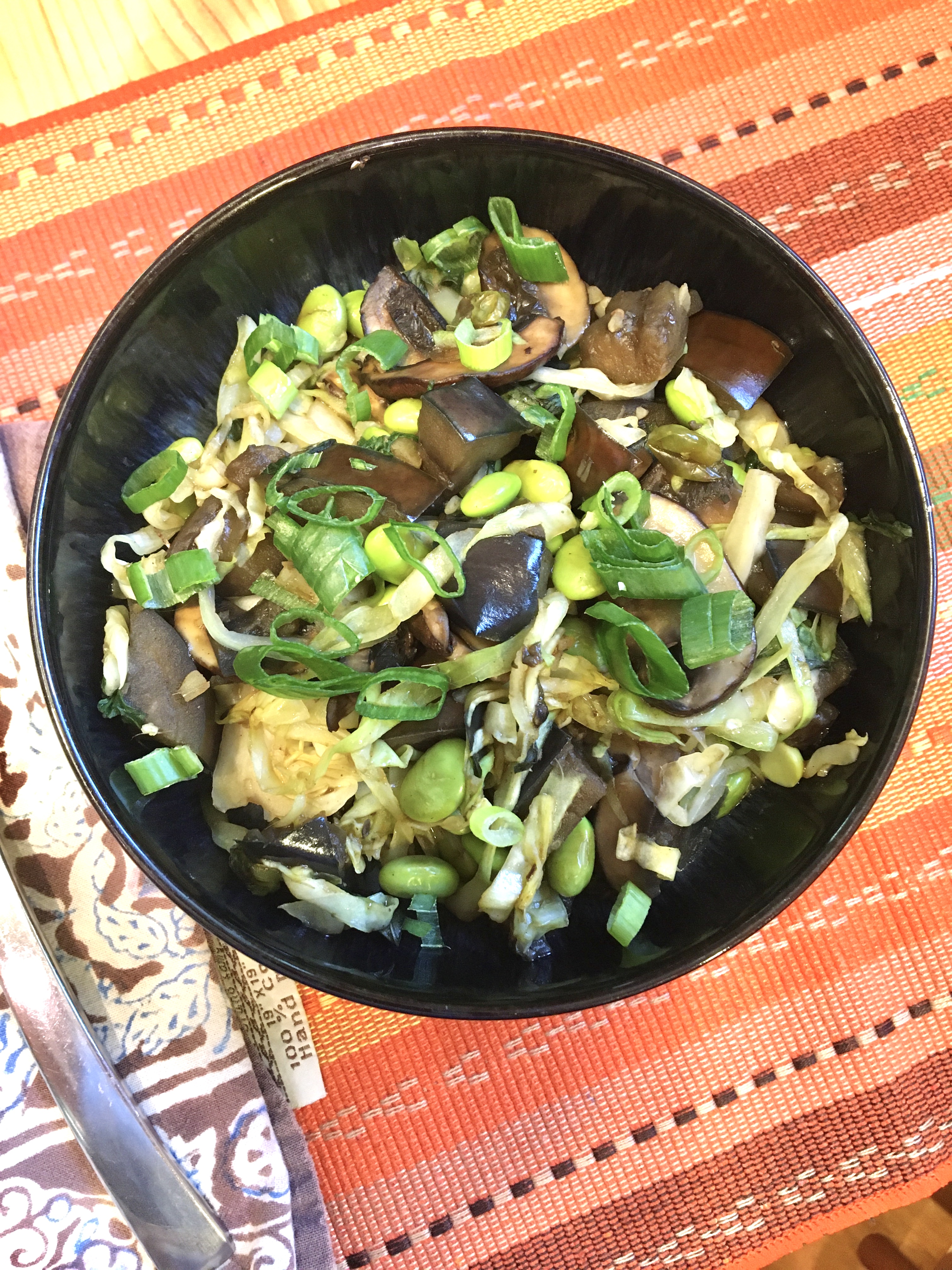 Saute until all the vegetables are tender and have decreased in volume by about 50%. Add the edamame, basil, and the oyster or hoisin sauce (if using).