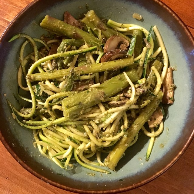 Ingredients: (Makes 6-8 servings of pesto) 1 packed cup of fresh basil leaves 1/2 cup olive oil 1/4 cup walnuts 1/4 raw pumpkin seeds 2 tablespoons parmesan (this was all we had in the house) pinch of salt Other common substitutes for a bare pantry pesto are to only use walnuts or only use pumpkin seeds. In […]